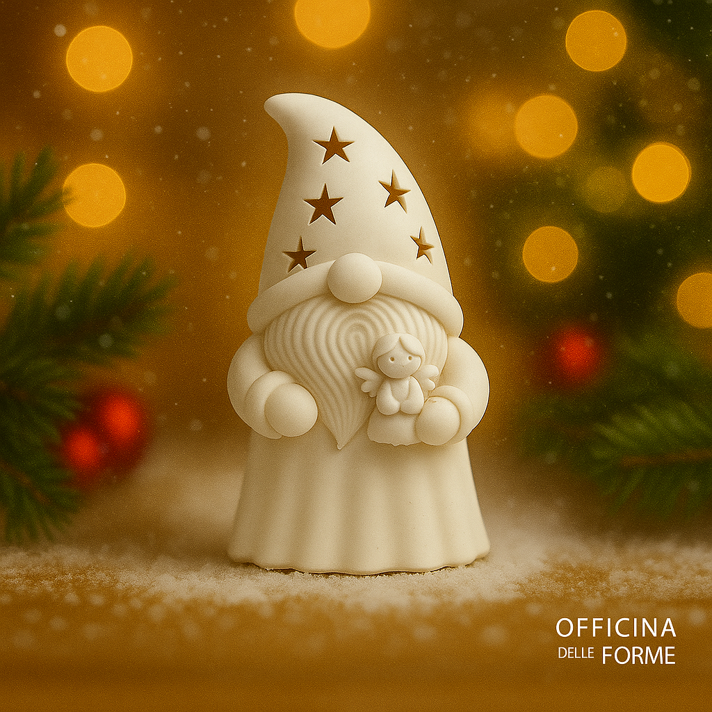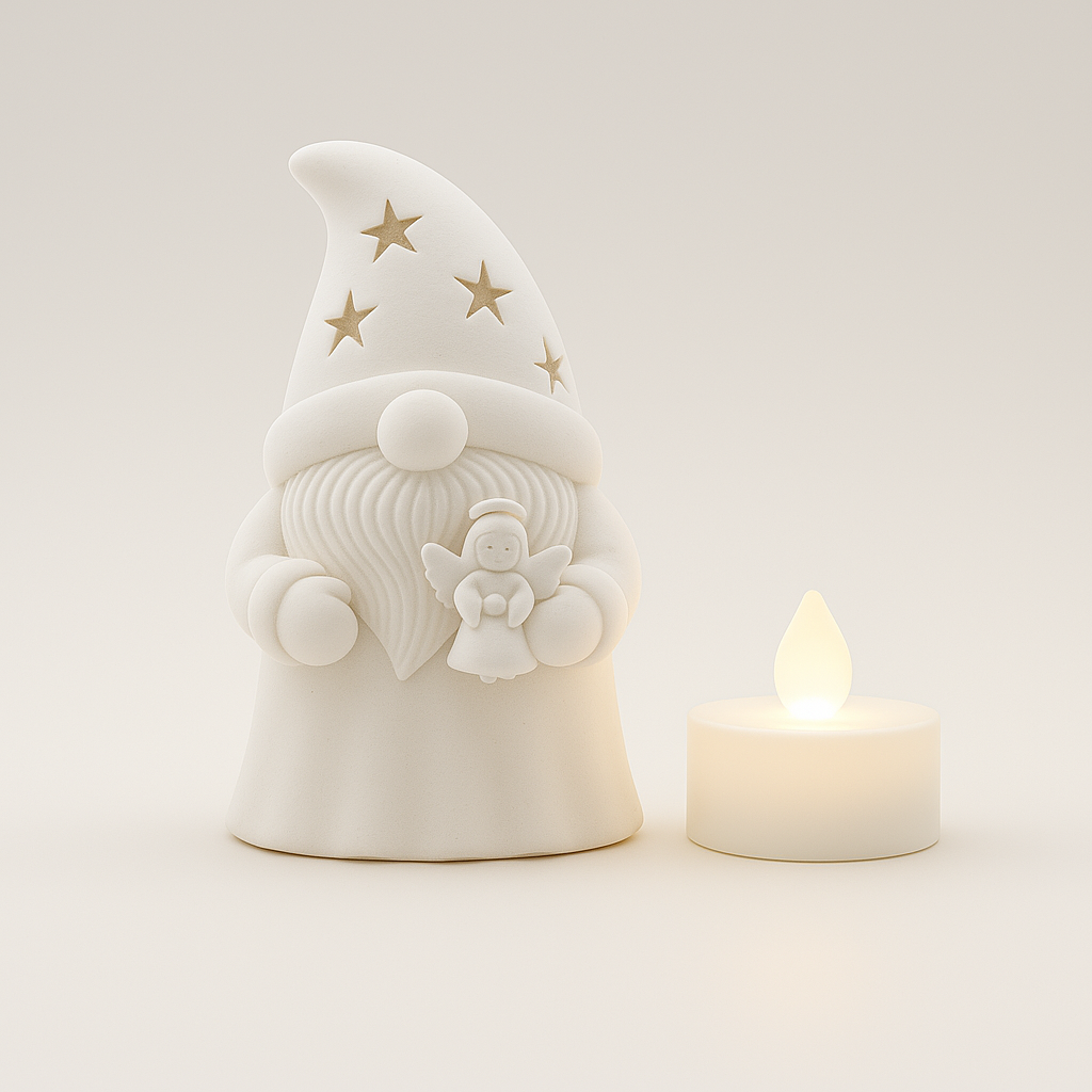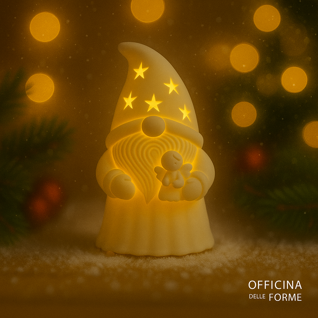 Gnomo segnaposto a lanterna con motivo Angelo (in mano), stampato in 3D in PLA bianco matte e rifinito a mano. Perfetto al centro del piatto: da spento è elegante, con tealight (LED consigliata) crea un bagliore caldo attraverso i trafori.
