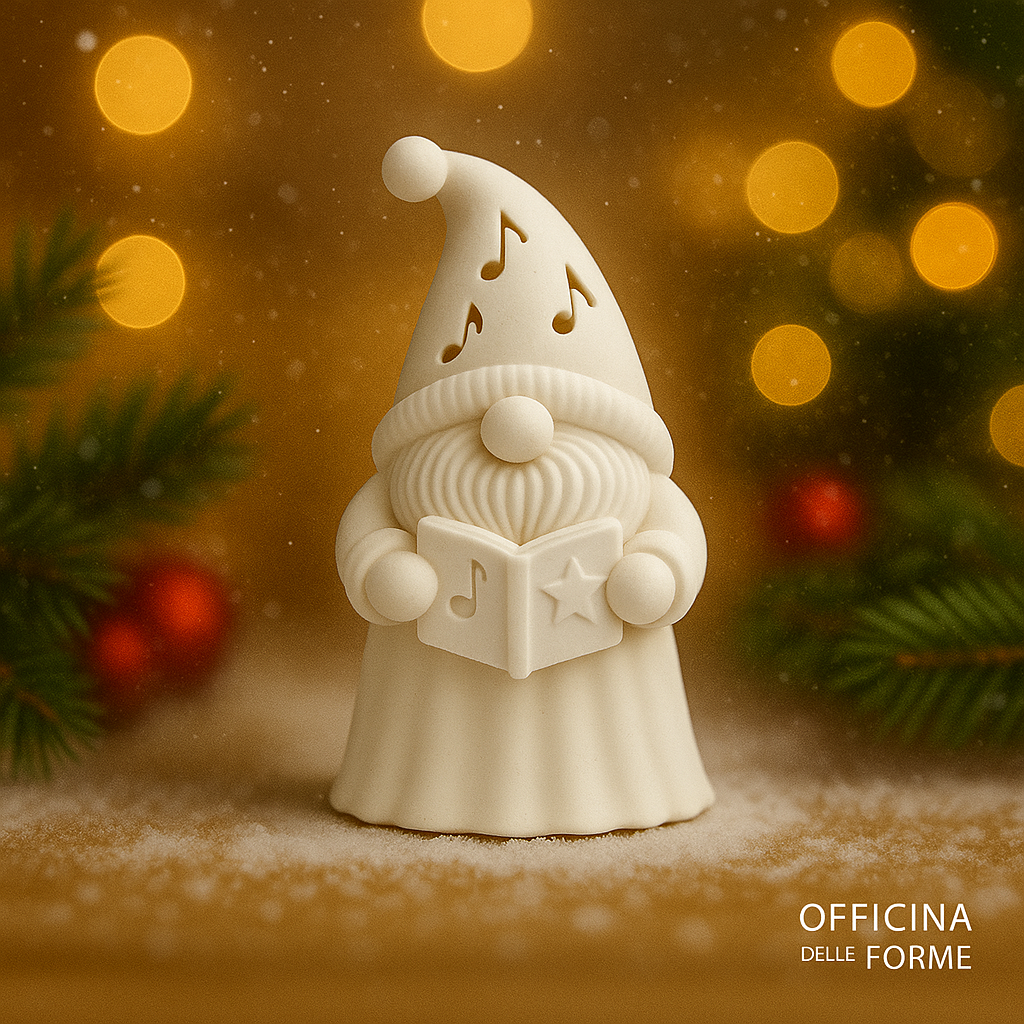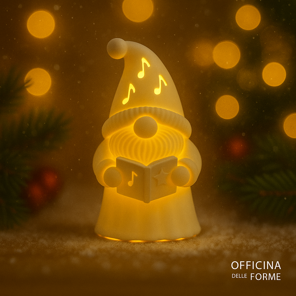 Gnomo a Lanterna con motivo Cantore (libro & note), stampato in 3D in PLA bianco matte e rifinito a mano. Perfetto vicino al piatto: da spento è elegante, con tealight (LED consigliata) crea un bagliore caldo attraverso i trafori.